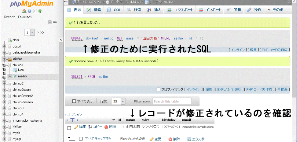 編集が終了すると一覧画面に戻ります。画面上部には実行されたSQL(UPDATE文)が表示されています。