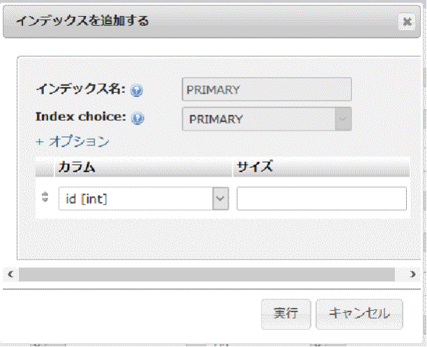 idのprimary keyのカラムは、『インデックス』のドロップダウンリストで『PRIMARY』を選択します。