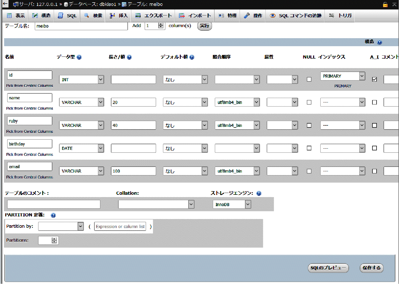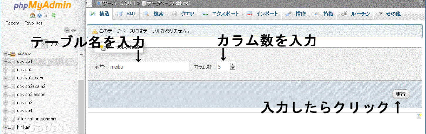 『名前』の欄にはmeibo、『カラム数』には5と入力して『実行する』をクリックします。