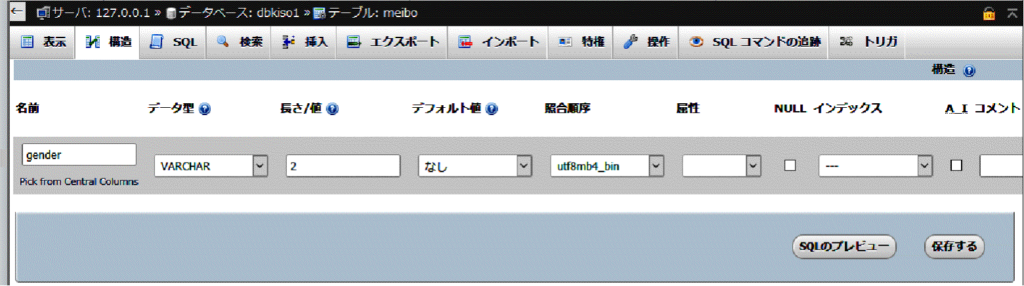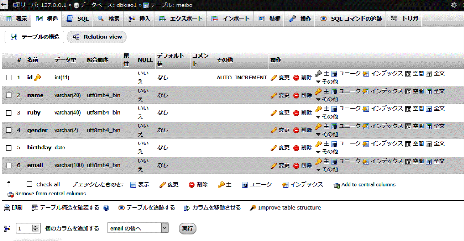 | name | VARCHAR | 20 | なし | utf8mb4_bin | |