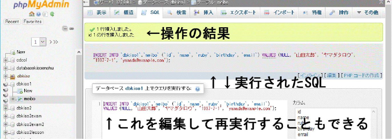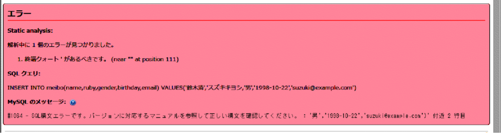 この画面から、表示されているエラーメッセージを参考にして下の欄に表示されているSQLコマンドを修正して再実行することも出来ます。この例では、’スズキキヨシ’の後の引用符が抜けています。