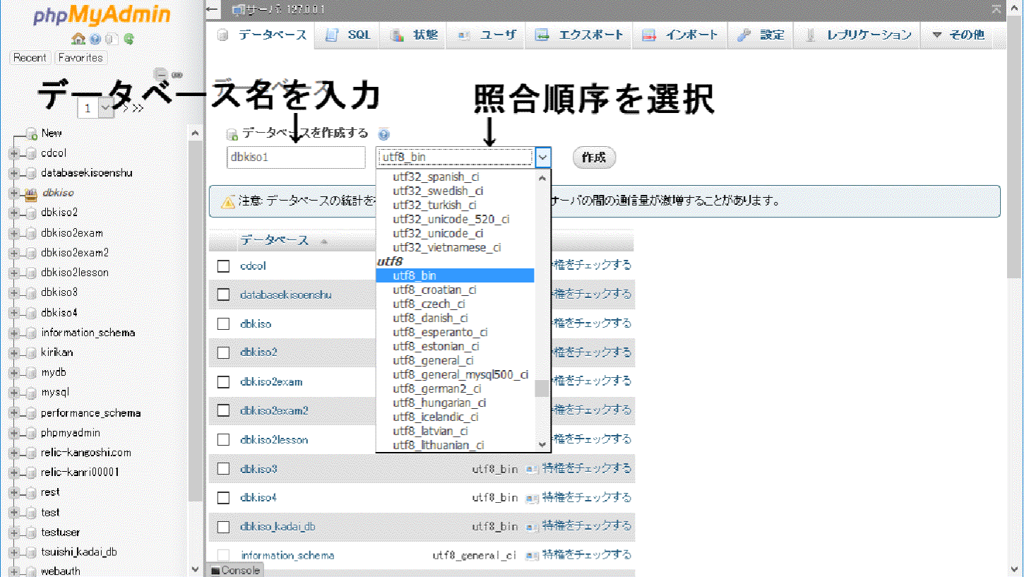 照合順序③は utf8mb4_bin を選択して『作成』ボタンをクリック