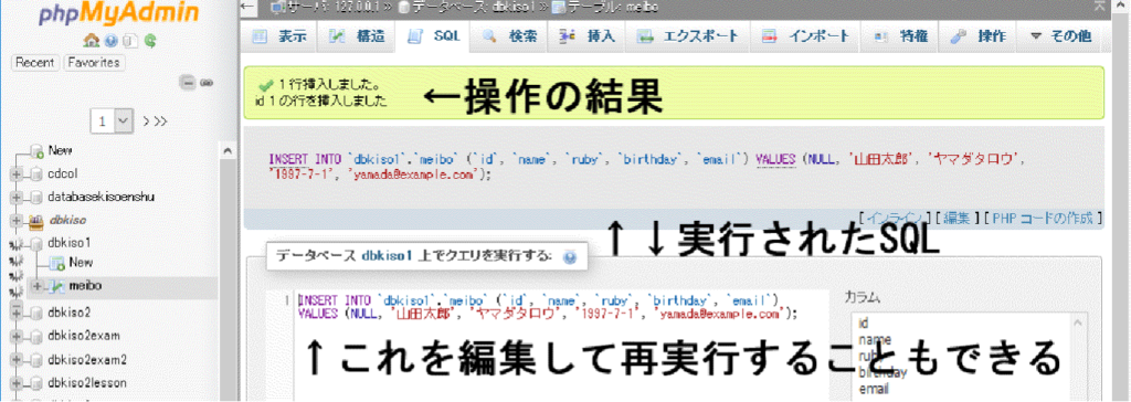 phpmyadminではGUIによる操作だけではなく、SQLを実行することが出来ます。