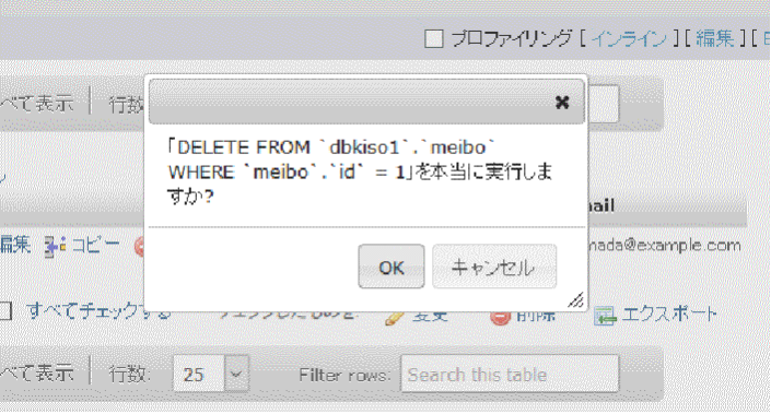 このような確認ダイアログ(実行するDELETEコマンドが表示されています)が表示されますので、『OK』をクリックすると削除されます。