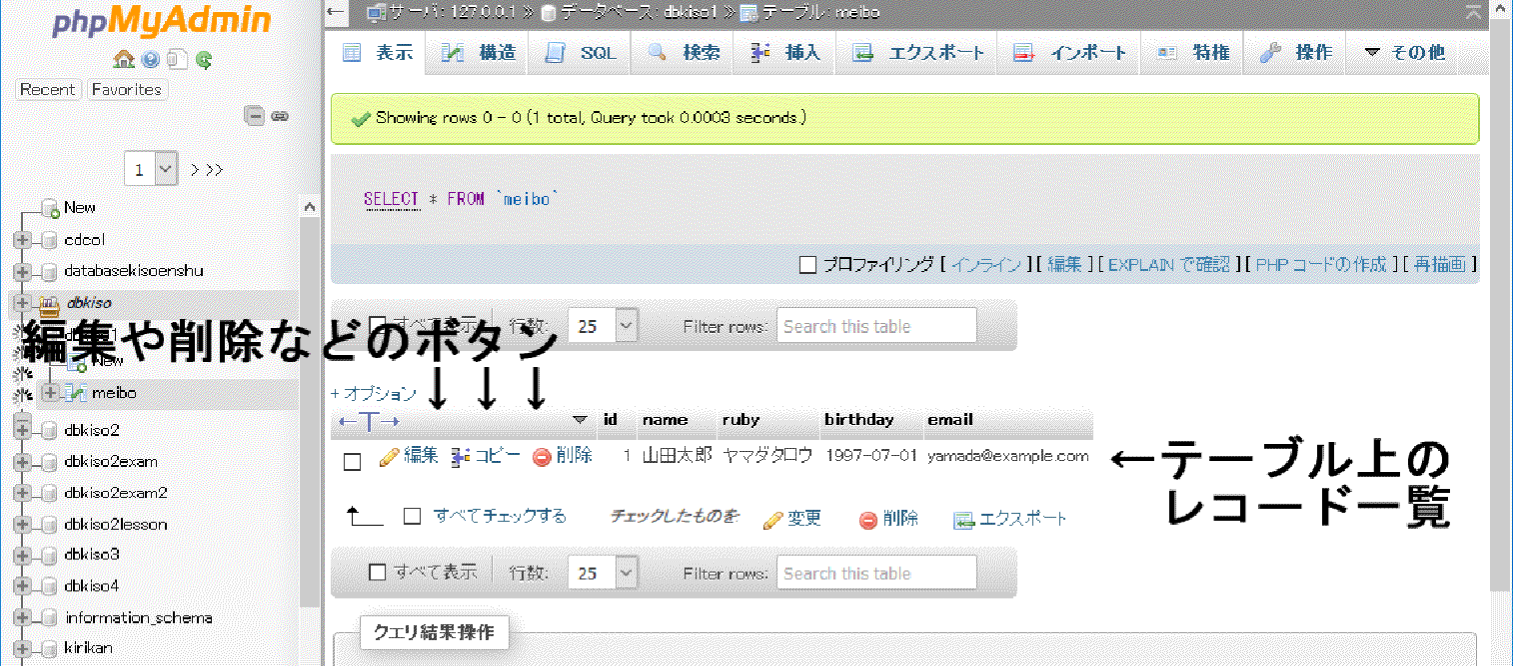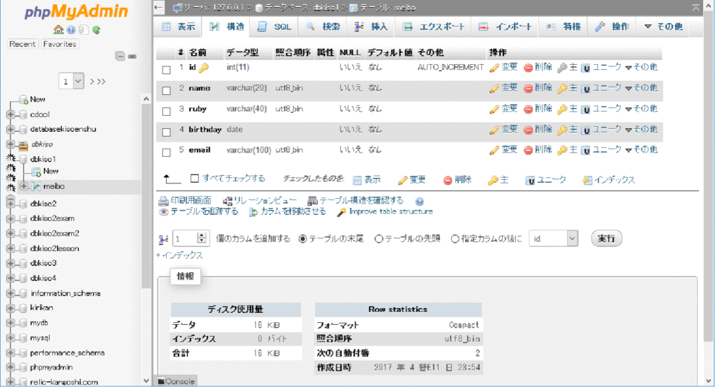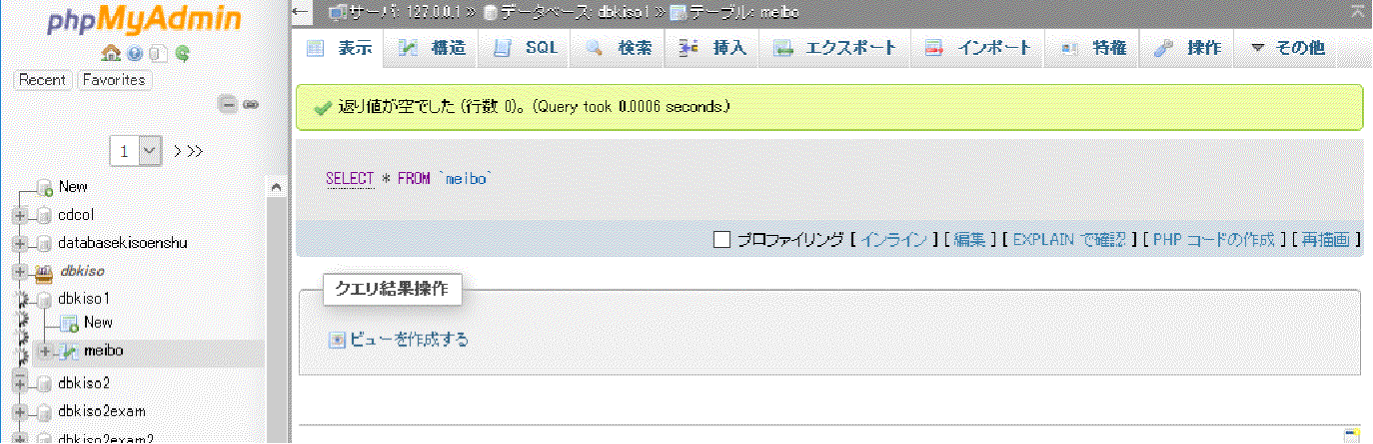 メインページからテーブルdbkiso1を選択すると、左サイドメニューのdbkiso1の下に存在するテーブル名の一覧が表示されますので、先ほど作成したmeiboをクリックします。