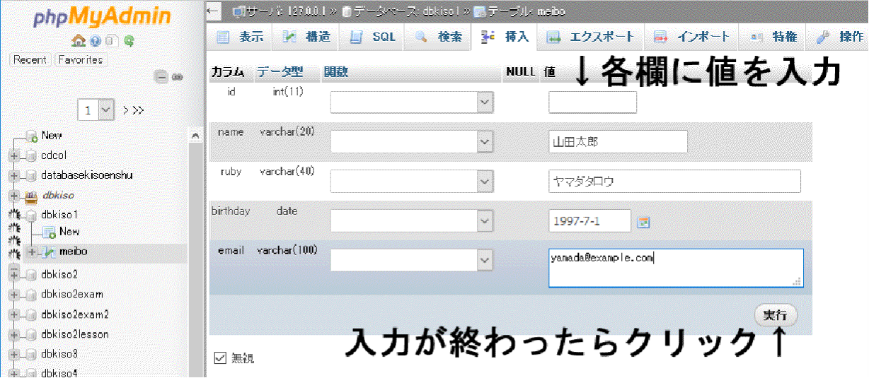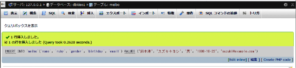 INSERT INTO meibo(name, ruby, gender, birthday, email)