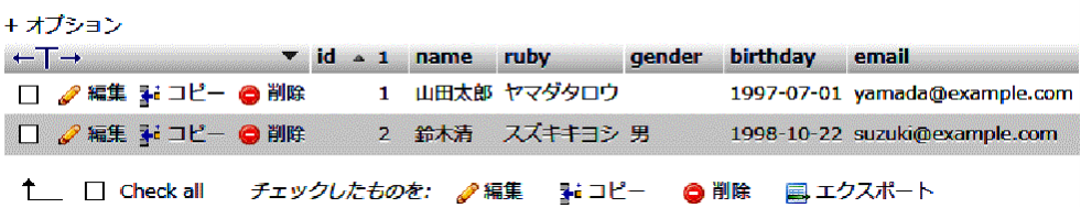 (1, '山田太朗', 'ヤマダタロウ', '', '1998-7-1', 'yamada@example.com'),