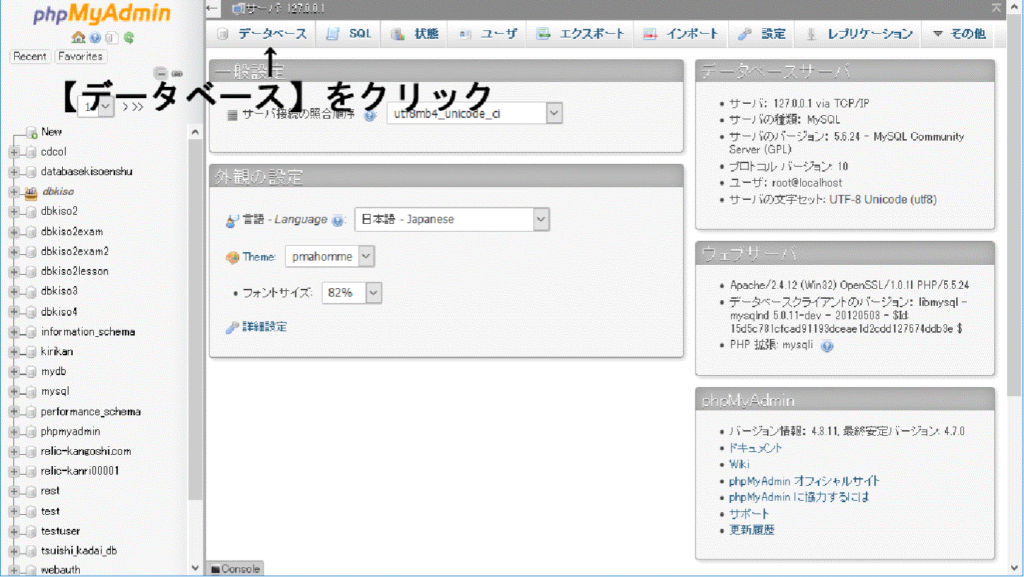 テーブルの作成などデータベースに対して操作を行う場合は、メインページの左端にあるデータベース一覧から操作をしたいデータベースを選択します。
