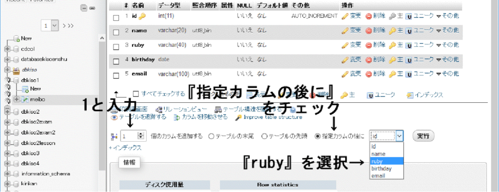 個数は1、『指定カラムの後』をチェックし次のドロップダウンリストで『ruby』を選択して『実行』をクリックして下さい。