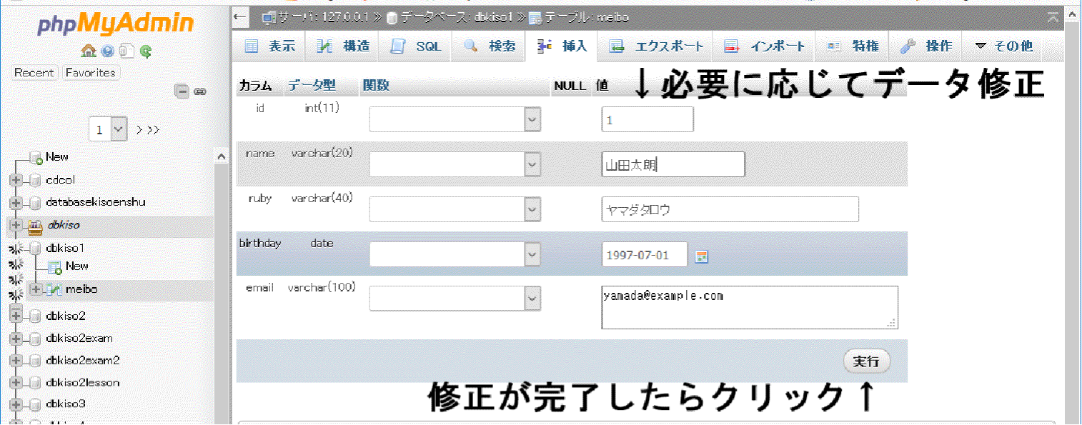 編集画面は挿入画面とほぼ同じもので、編集対象のレコードの各フィールドの値が入力欄に初期値として入力された状態になっています。『実行』をクリックするとデータが上書きされます