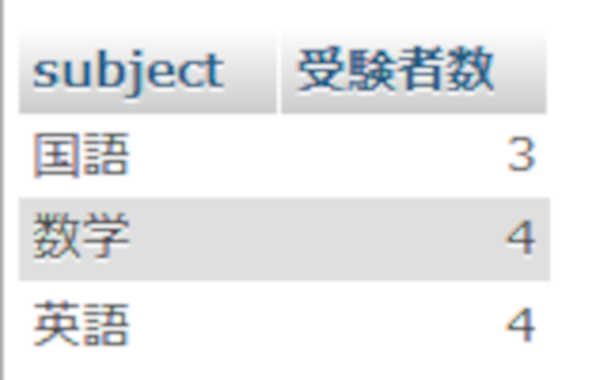 FROM examination GROUP BY subject;グループ化をする場合、グループ化に使用したカラムおよびグループ関数による計算結果のみ表示することが出来ます。