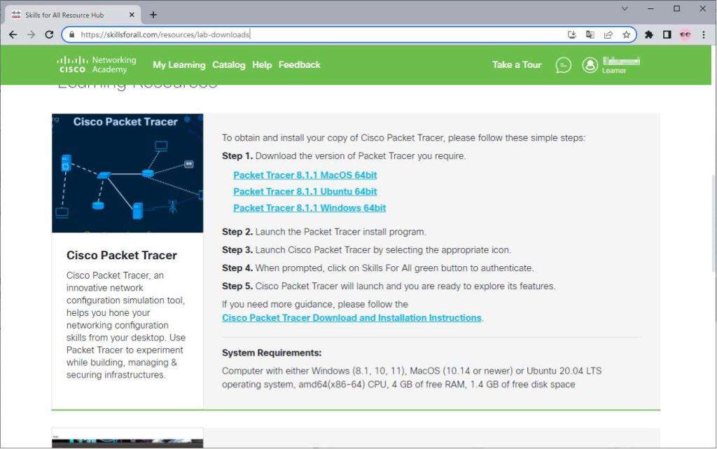 続いて、PacketTracerインストーラをダウンロードしてインストールします。ダウンロードにはログインした状態でなければなりませんが、アカウント登録完了した時点で自動的にログイン状態になっているはずなので、そのままブラウザを閉じずに続けて作業します。後日改めて作業する場合は画面右上の『Login』アイコンからログインして下さい。