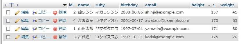 SELECT * FROM meibo ORDER BY height;実行結果