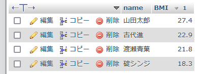ORDER BY BMI DESC;実行結果