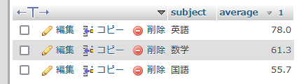 FROM examination GROUP BY subject ORDER BY average DESC;実行結果