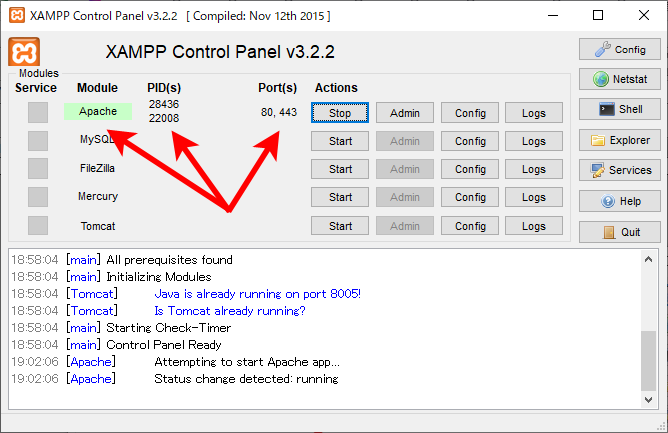 Moduleの部分が緑色になり、PIDやPort(s)が表示されれば起動成功です。設定がデフォルト通りなら、Port(s)には80(http)と443(https)が表示されているはずです。