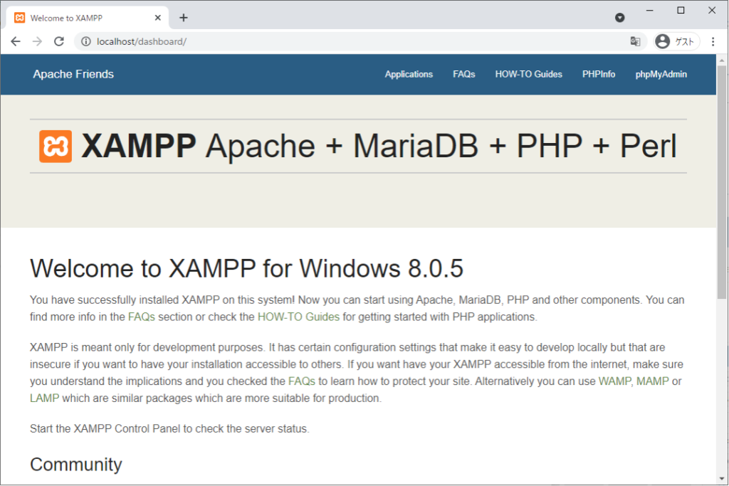 Apacheが起動したら、Webブラウザを起動してURL欄に『http://localhost/』と入力してEnterを押してみましょう。下のような画面が表示されればApacheは正常に動作しています(自動的に http://localhost/dashboard/ にリダイレクトされます)。