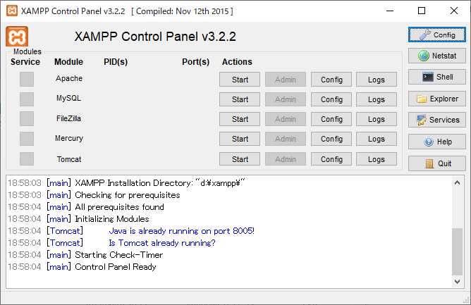 これで直接動作確認ができるのはApacheだけですが、Apacheが動作するならXAMPPのインストール自体は正常に行われたと思って良いでしょう。