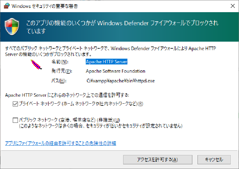 途中でこの画面が表示されることがあります。必要に応じて画面下半分にあるチェックボックスを設定してから(ローカル環境で実験するだけの場合はデフォルトの『プライベートネットワーク』だけにチェックが入った状態で問題ありません)『アクセスを許可する』をクリックします。