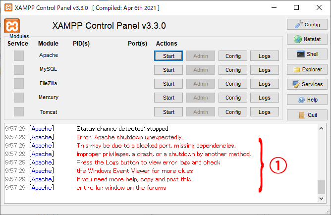 起動に失敗した場合、XAMPPコントロールパネル下部①にエラーメッセージが表示されます。これで失敗原因が判る場合もあるので、内容をチェックしましょう。