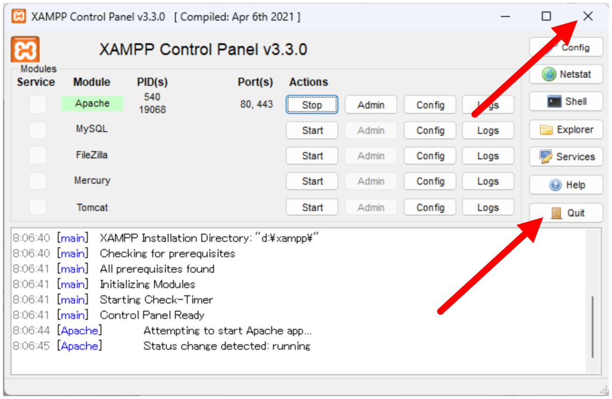 XAMPPコントロールパネルのウィンドウ右上の『×』または『Quit』をクリックするとXAMPPコントロールパネルが終了しウィンドウが消えます。