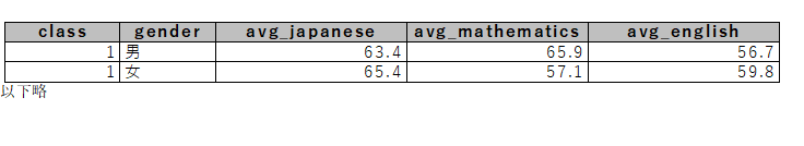 (6) クラス別・男女別に各科目の平均点を小数第1位まで求める。なお国語・数学・英語の平均点のカラム名はそれぞれavg_japanese、avg_mathematics、avg_englishとすること。