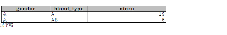 (8) 男女別・血液型別に人数(カラム名はninzuとすること)を出力する