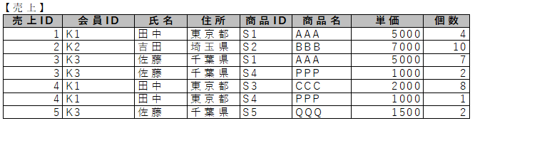 売上(売上ID、会員ID、氏名、住所、商品ID、商品名、単価、個数)