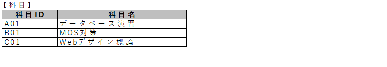 という関数従属がありますから、『科目ID』と『科目名』のテーブルを作ります。名前は『科目一覧』とでもしましょう。主キーは、もとの主キーを引き継いで『科目ID』にします。