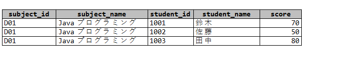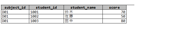 VALUES('1001','D01',70),('1002','D01',50),('1003','D01',80);では、必要なテーブルを結合して、subject_id=’D01’についての成績を出力するSQLを考えてみましょう。