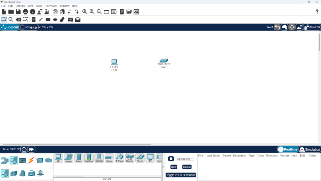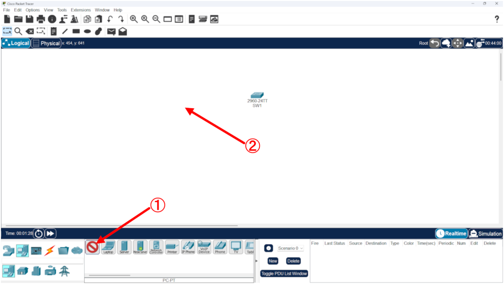 ごく簡単なネットワークをPacketTracer上で構築してみましょう。