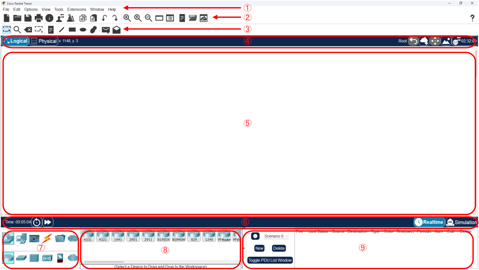 ② メインウィンドウの右上の『×』ボタンをクリックすると、PacketTracerが終了します。