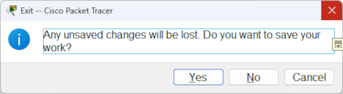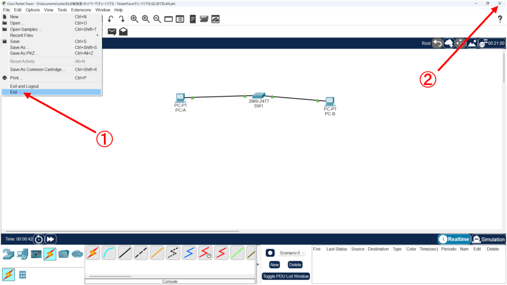 今回の作業はここまでにして、PacketTracerを終了しましょう。