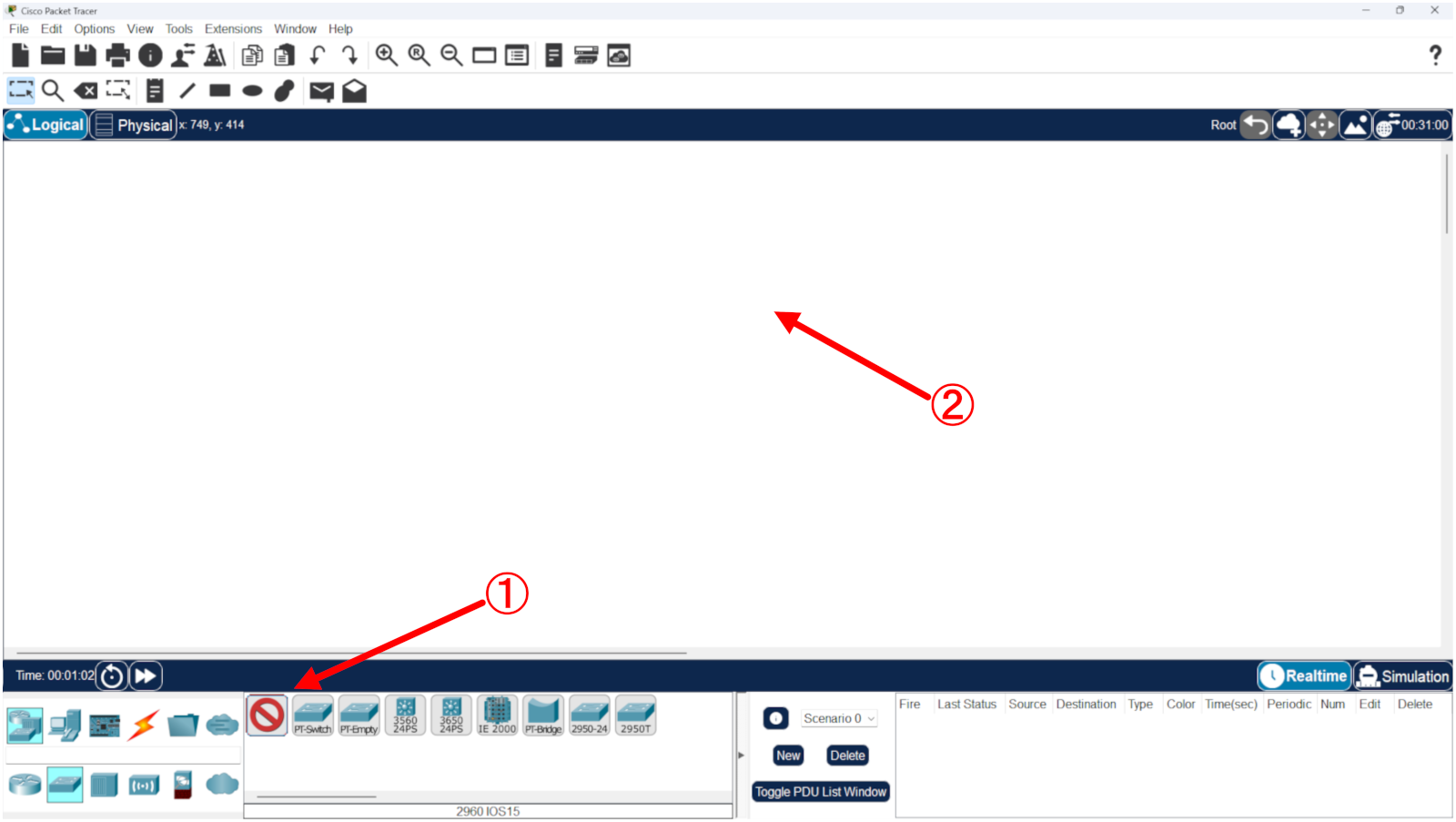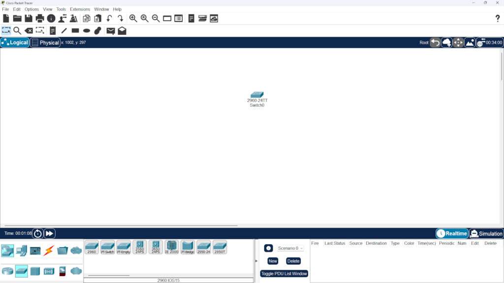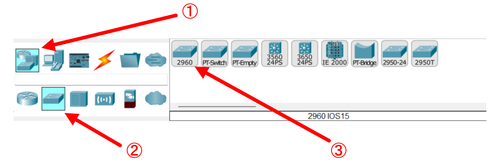 2960シリーズは Cisco Catalyst スイッチの定番モデルでした。すでにサポートが終了している古い機種なので実際に新規ネットワークを構築する場合は採用されないと思いますが、PacketTracerでの学習用には手頃なスイッチです。