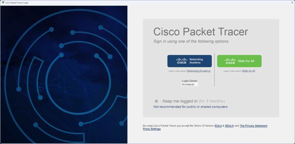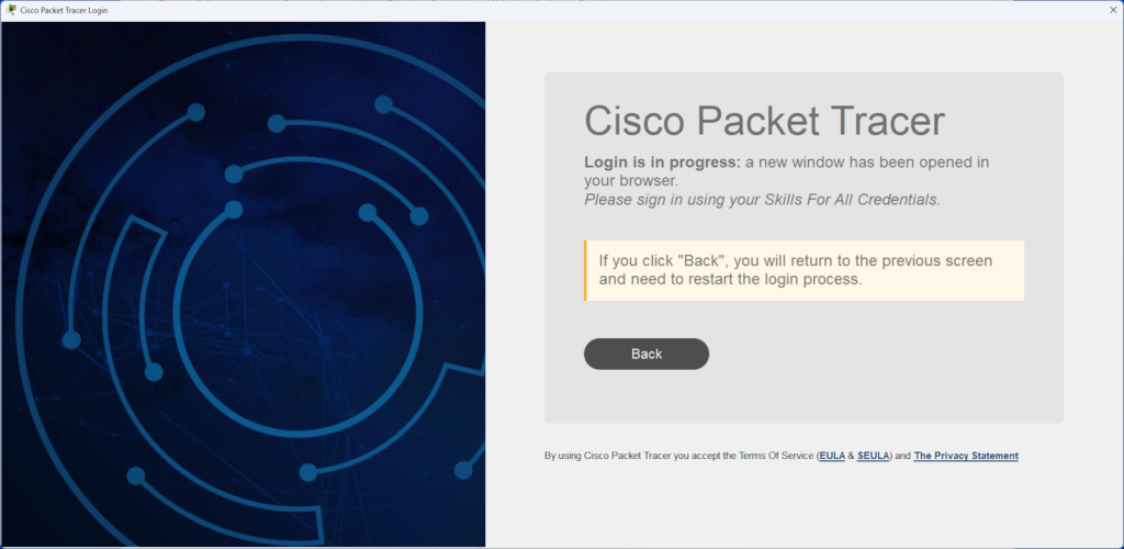 PacketTracerの起動時にこのような画面が表示されたときは、認証を行う必要があります。
