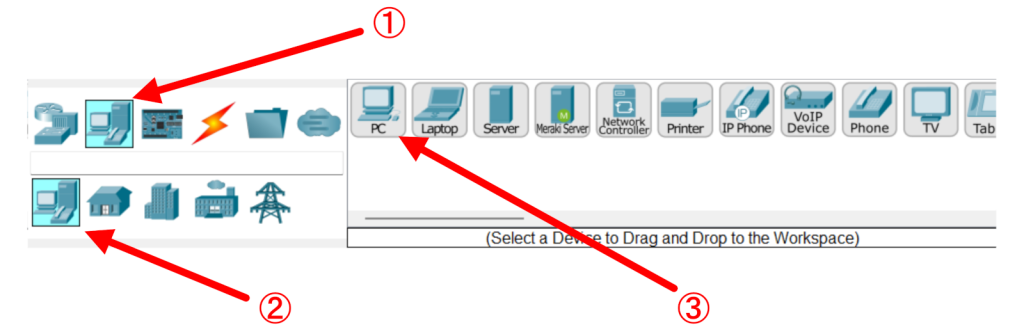 ③ デバイス選択ボックスで [PC] (PC-PT) をクリックして選択します。