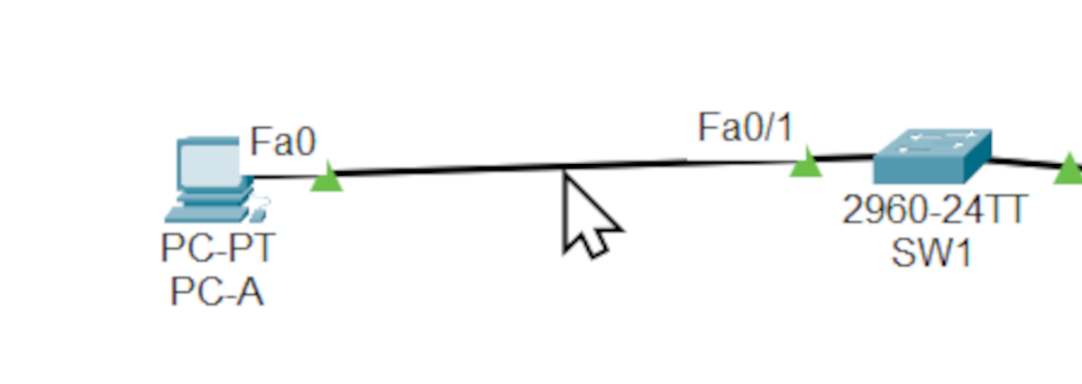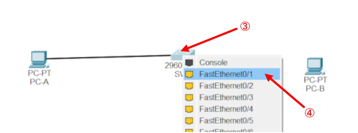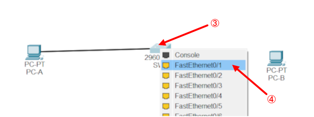 下の図では、マウスがさしているケーブルがPC-AのFa0(FastEthernet0)とスイッチのFa0/1(FastEthernet0/1)に接続されていることが判ります。