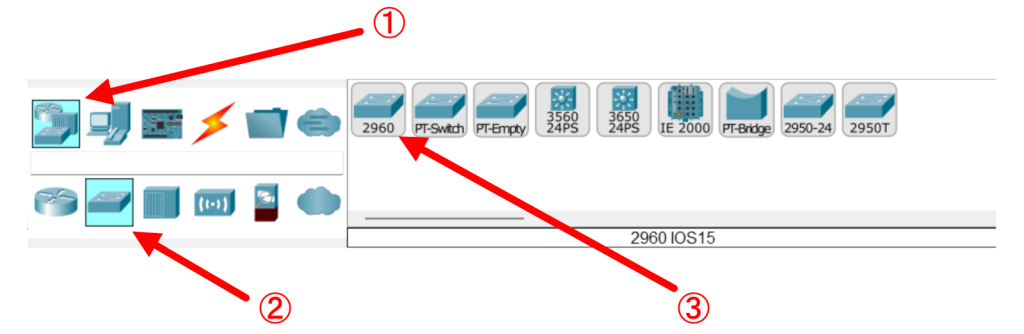③ デバイス選択ボックスで適当なスイッチを選択します。例としてここでは [2960] を使用してみましょう。