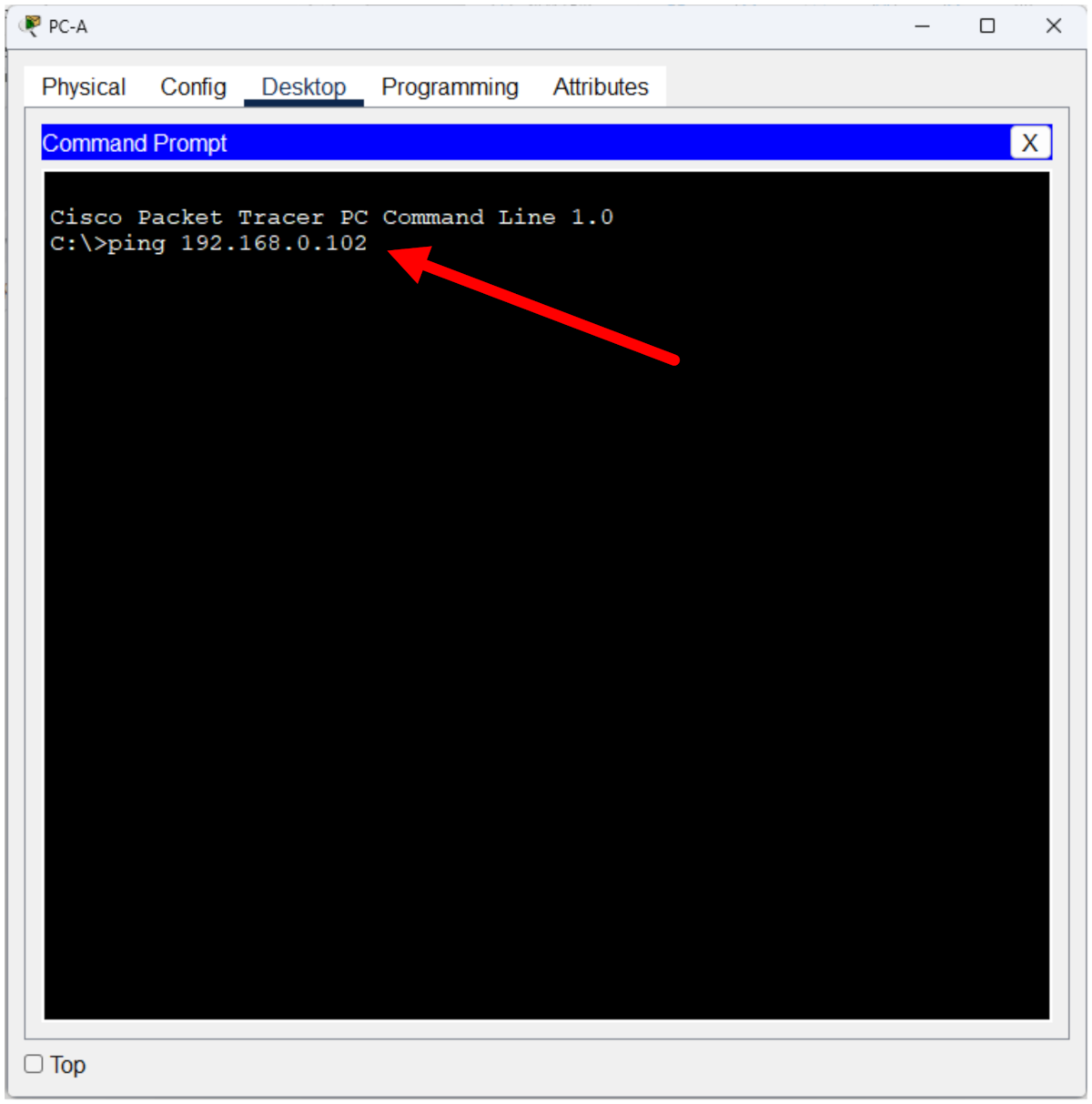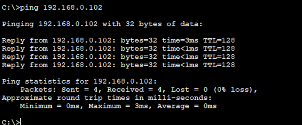 ここではpingコマンドで、PC-AからPC-Bへの疎通確認を行ってみましょう。『ping 192.168.0.102』と入力し、Enterを押します。