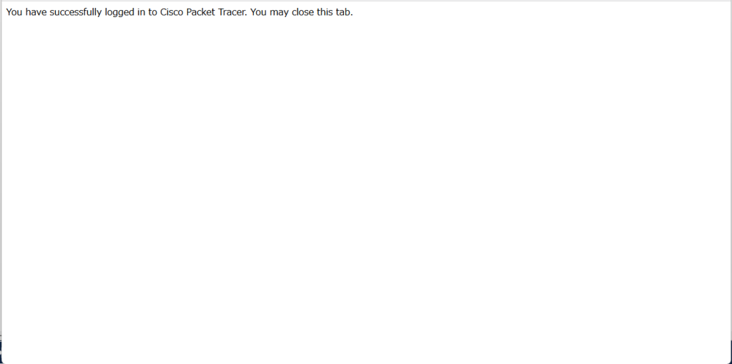 認証に成功すると、Webブラウザには『You have successfully logged in to Cisco Packet Tracer. You may close this tab』とメッセージが表示されます。これが表示されたら、認証ページが表示されていたWebブラウザ(タブ)は閉じて大丈夫です(自動では閉じません)。