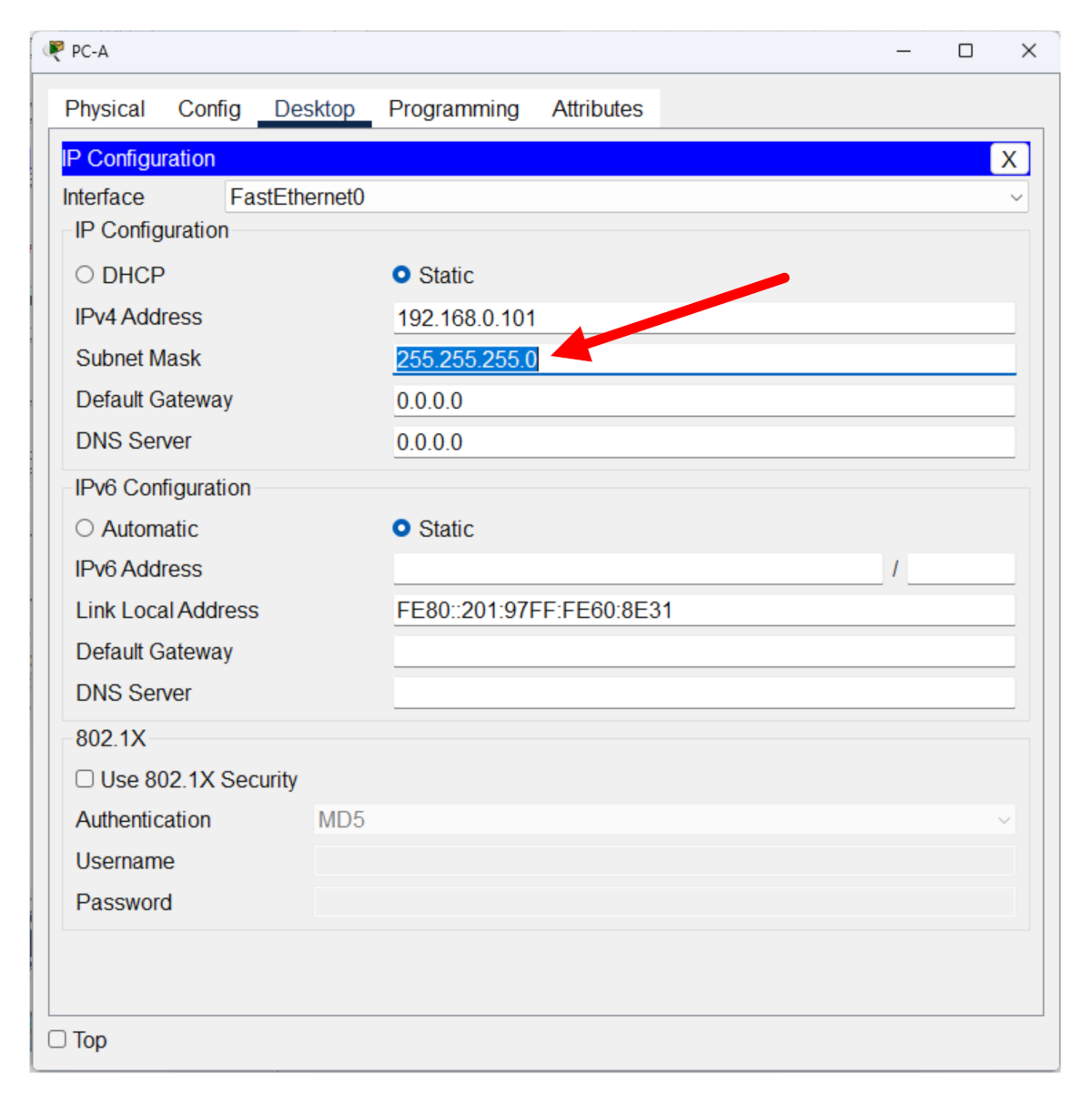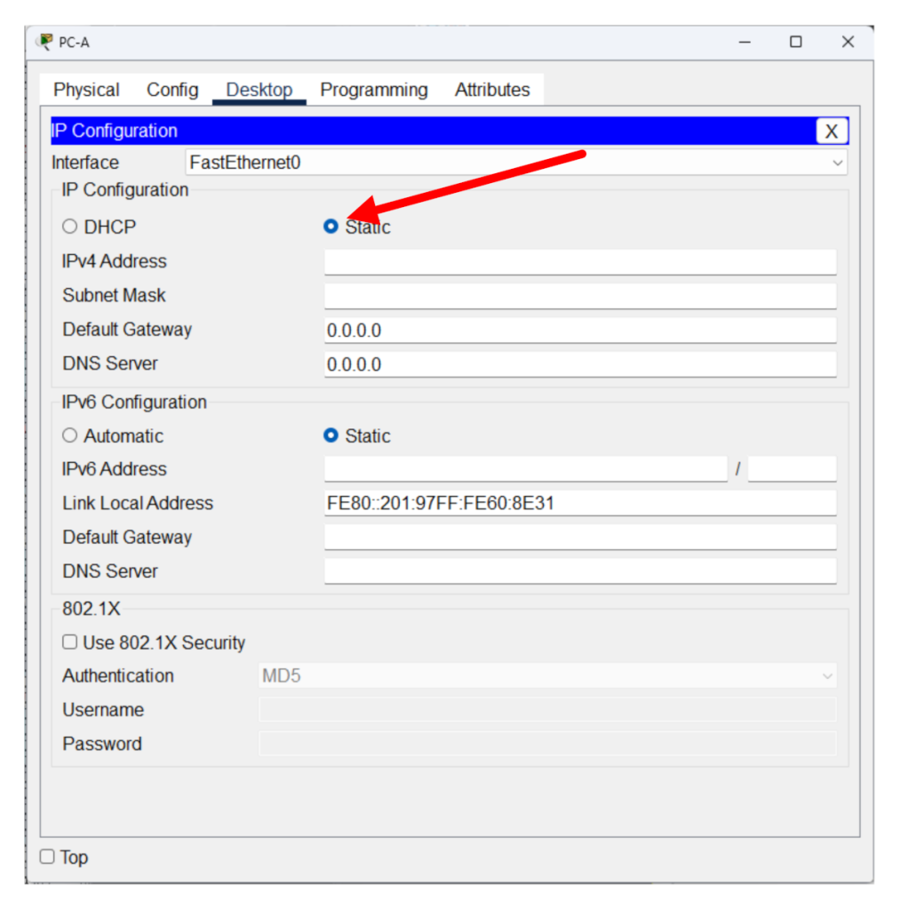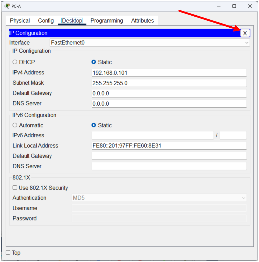 今回はデフォルトゲートウェイとDNSは設定しないので、これでPC-AのIPv4アドレスの設定は完了です。この画面には『OK』や『Apply』などのボタンはなく、このまま右上の『×』ボタンを押してPC操作画面を閉じても設定は反映されます。