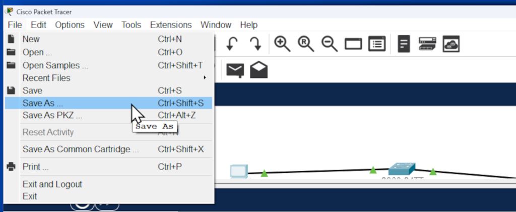 せっかく作成したネットワークを保存したい場合は、メニューバーの [file]→[Save As] を選択します。『.pkt』という拡張子でファイルが保存されます。次回PacketTracerを起動したときにメニューバーの [file]→[Open] からこのファイルを読み込めば、今回の続きとして作業を行うことが出来ます。
