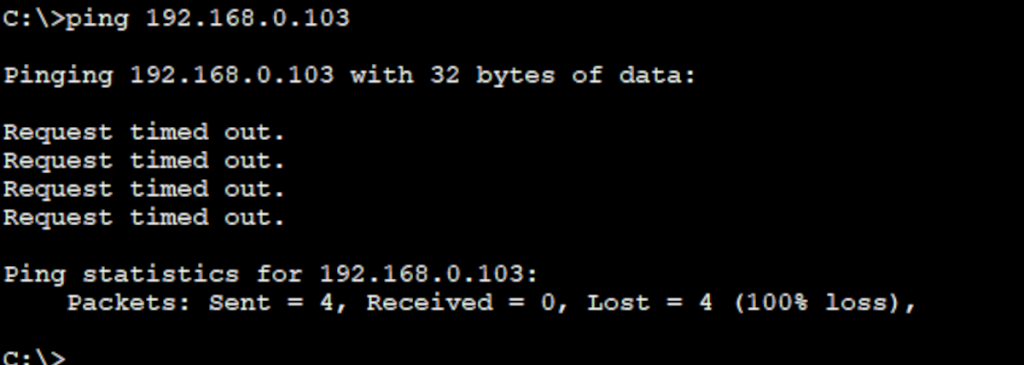 続いて、このネットワーク上に存在しないアドレス 192.168.0.103 に対して ping を実行してみましょう。『ping 192.168.0.103』と入力します。