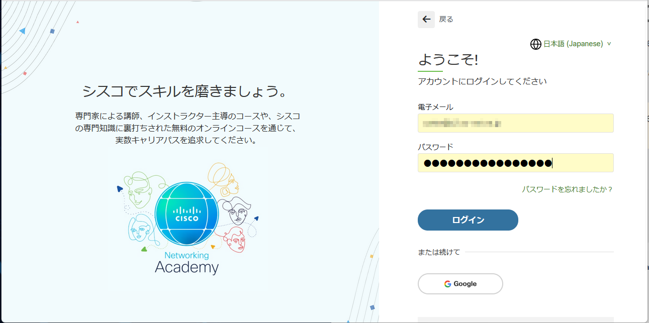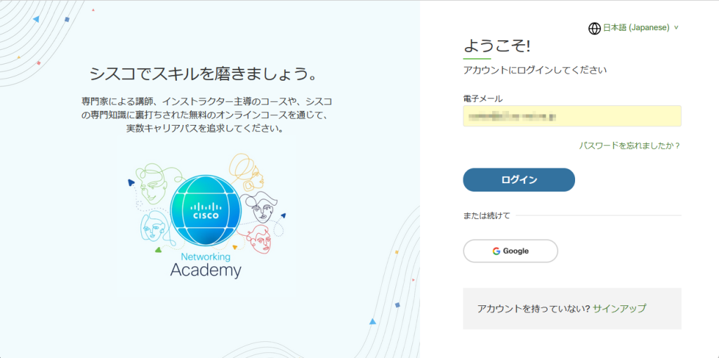 『CISCO Networking Academy』または『CISCO Skills For All』のいずれかをクリックすると下の画面が表示され、PacketTracer とは別にWebブラウザが起動します(すでに起動しているWebブラウザがある場合は新しいタブが開きます)。