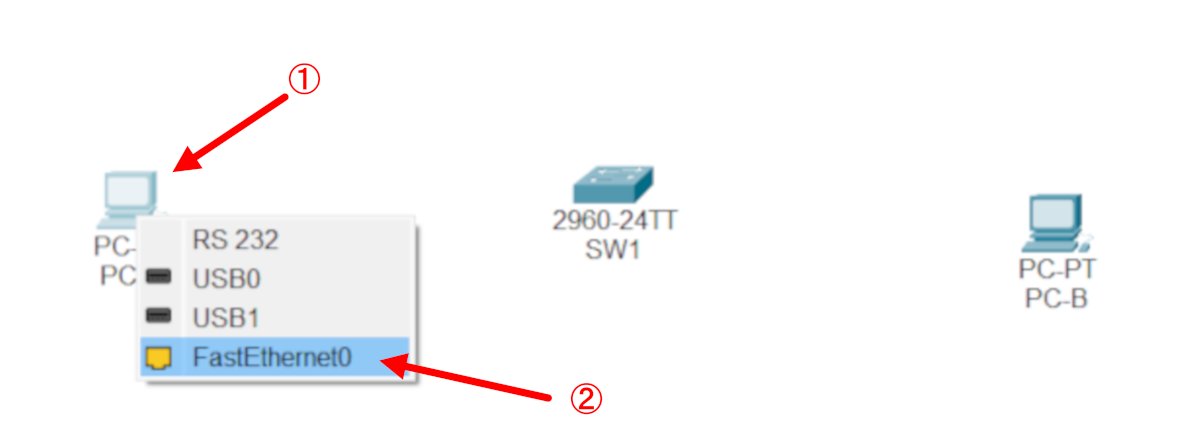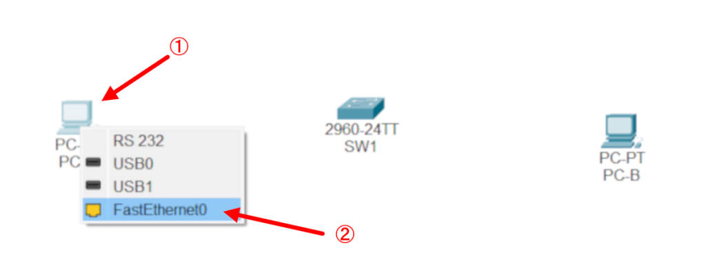 ②PCの接続先インターフェイスの一覧が表示されるので、FastEthernet0 を選択します。