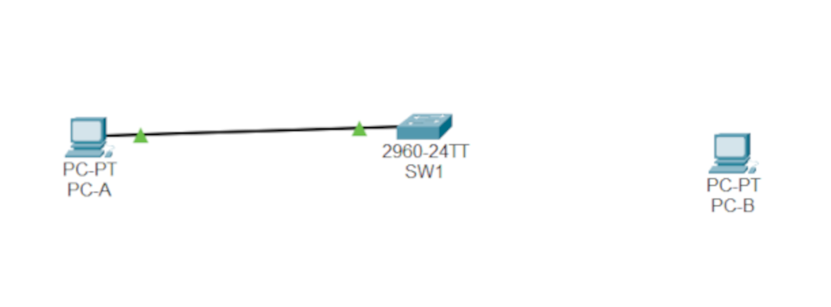 これでPC-0とスイッチが接続されました。線の両端に表示されている『緑色の▲』や『オレンジ色の●』はポートLED(インターフェイスの動作状態を表すLED、実機でもインターフェイスの近くに実装されている)です。緑色だと正常動作中です。