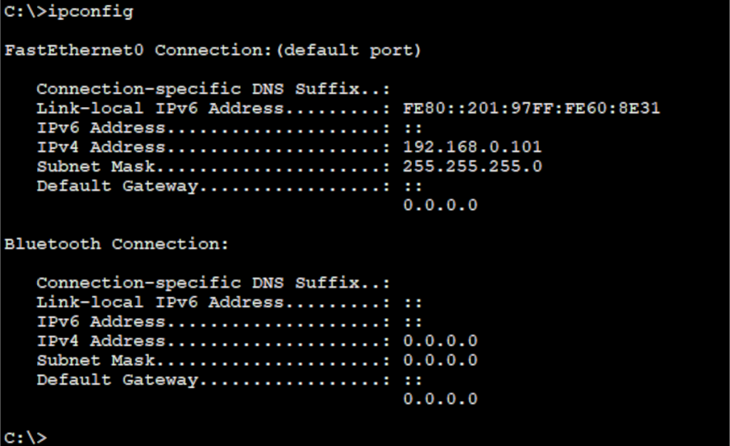 さらに、ipconfig コマンドも試してみましょう。PacketTracerのipconfigコマンドは、Windowsのコマンドプロンプトの ipconfigコマンドや、Linuxの ifconfigコマンドとよく似た動作をします。