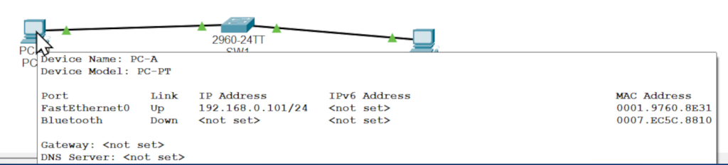下の図では、PC-Aのネットワークインターフェイスに 192.168.0.101/24 というIPアドレスが設定されていることが判ります。